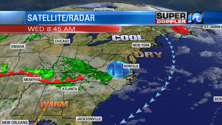 Basically there is some warmer/more humid air to the west, and it’s trying to push northeast into the cooler/drier air mass. Luckily we’ll be on the cool/dry side of the high, but we will still catch some high/thin clouds through the day. High temps will be in the upper 60s. There is a light northeast wind. So it will be a little cooler near the shore. However, I think we will hit some 70s inland and south.