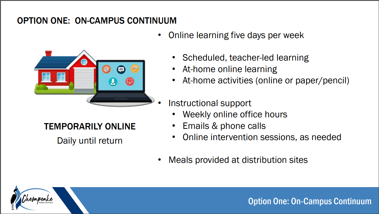 Option one would be an on-campus continuum. Depending on the COVID-19 rates and taking into consideration VDOE guidance, this option could include traditional five days a week on campus learning, a blend of in person at at-home learning or temporary online learning.