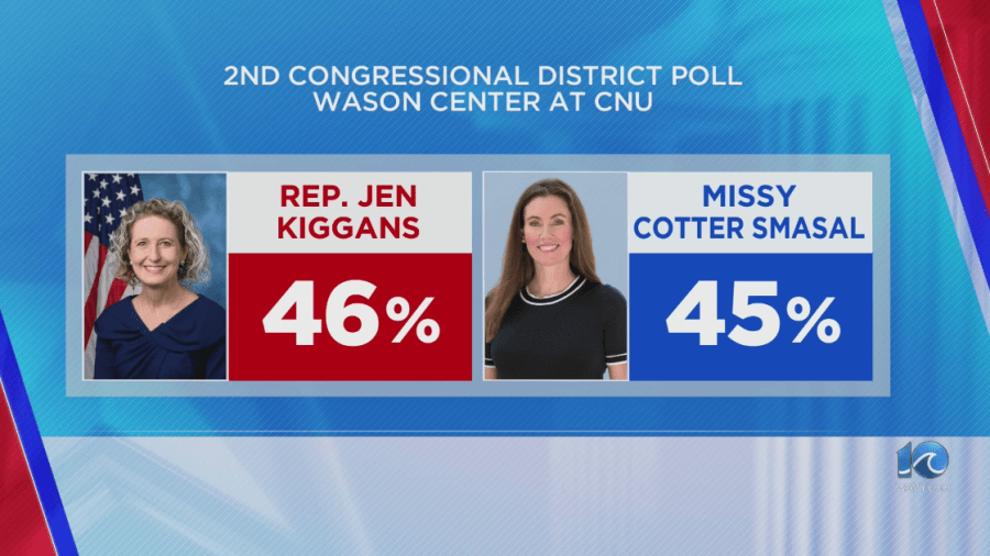 VIRGINIA BEACH, Va. (WAVY) — Incumbent Republican Jen Kiggans is up just 1 point over Democrat Missy Cotter in the latest polling from Virginia’s 2nd Congressional District.