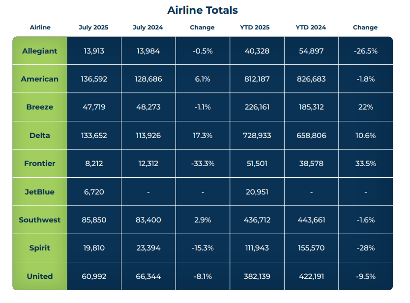 Above, the number of passengers who flew on a particular airline in July 2025 versus July 2024 (Graphic: Norfolk International Airport)