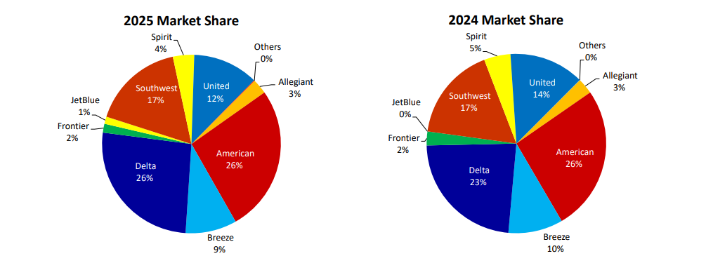 Airline market share at Norfolk International Airport through July 2025, versus market share through the same period in 2024. (Graphic: Norfolk International Airport)