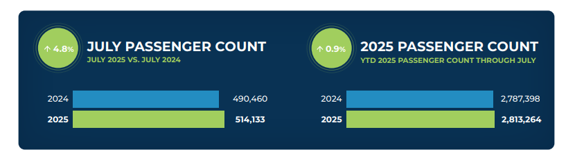Through July, more than 2.8 million passengers have traveled through Norfolk International, up a little more than 1% from the same period in 2024.