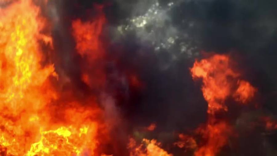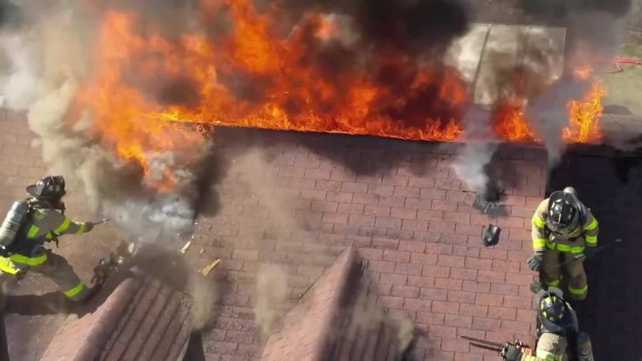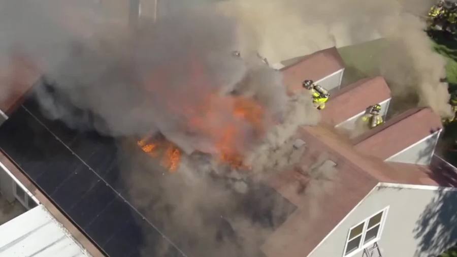 Photos from the scene show heavy fire and smoke coming form the roof of a two-story structure.