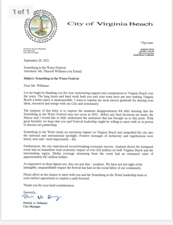 “We’re disappointed that he’s feeling that way. Something in the Water was very, very big and positive for the City of Virginia Beach. Unfortunately last year with the COVID, we had to cancel it. But one again … the manager and I want to connect with Pharrell, sit down talk things out and that’s what we’re going to take. We are going to try to be positive about this and we are going to try to make a case that, you know, we are moving forward,” Dyer said.