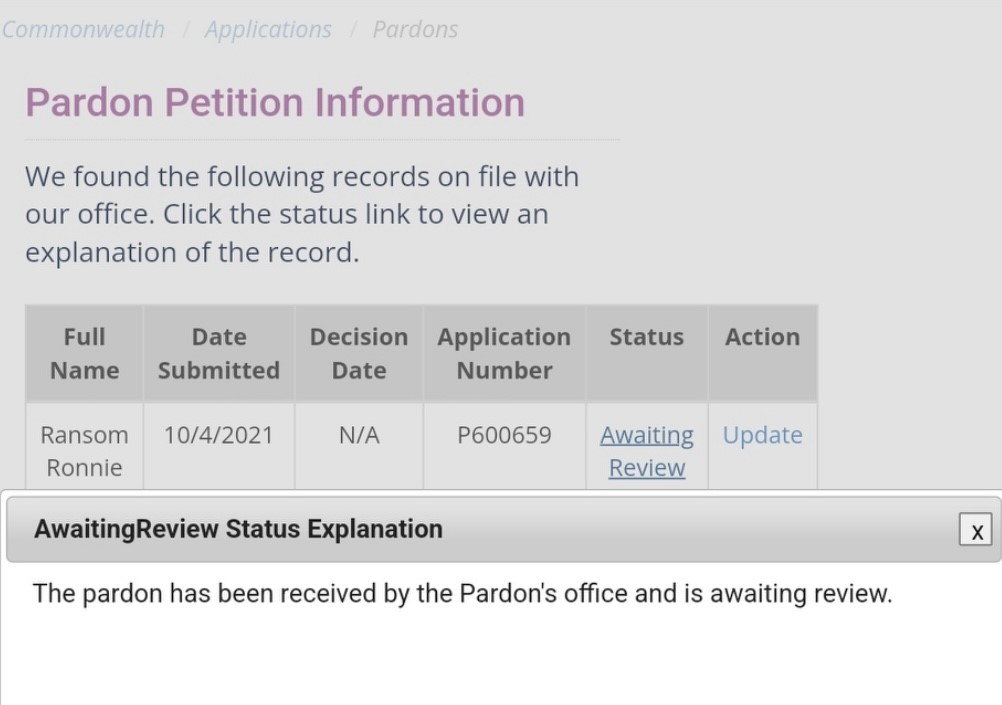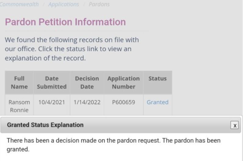 “If you click on the status, it says that a decision has been made on the pardon request the pardon has been granted,” explained Ericka Grandel.