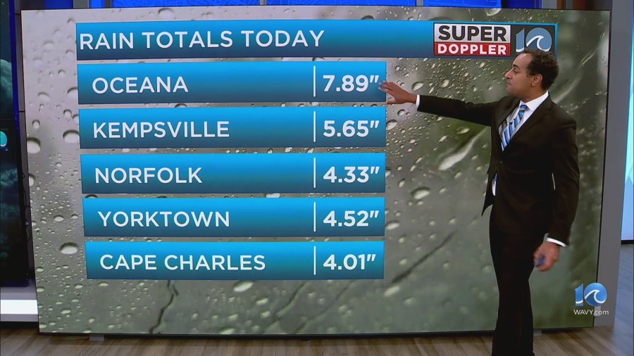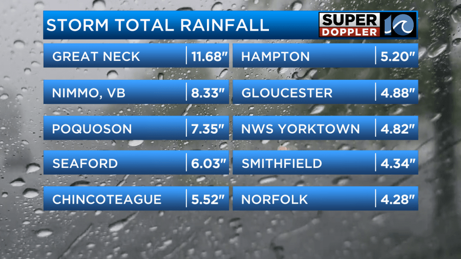 Some compared the flooding to that of Hurricane Matthew in 2016 as repairs and clean-up activities took place across the city. The highest rain totals came in Virginia Beach, where more than 11 inches fell in the Great Neck area, and more than eight inches fell in the Nimmo area. Other areas across the region got four-to-six-inches or more of rain.