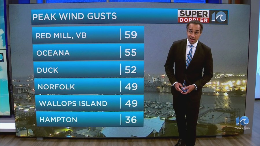 Wind gusts peaked at nearly 60 mph in some parts of the region Tuesday, including a 59 mph wind gust in the Red Mill area of Virginia Beach and 55 mph in Duck on the Outer Banks.